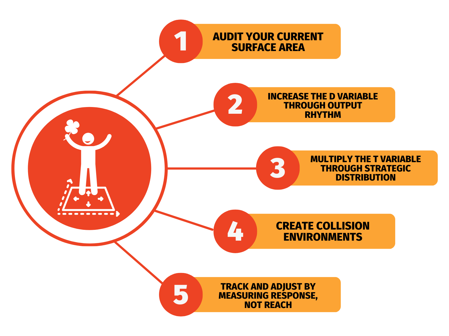 - Track and adjust by measuring response, not reach. Surface area without feedback loops wastes information. Note which pieces generate conversations, which platforms produce real connections, which environments yield collaborators. Double down on working variables. Abandon channels that produce impressions without interaction. Impressions are phantom surface area.